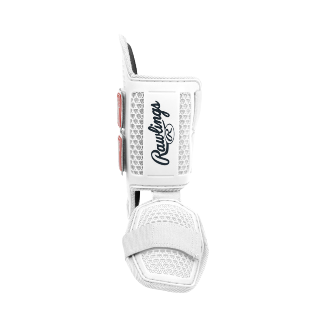 Attack every pitch with confidence when you're wearing this Rawlings Leg Guard in the box! This new batter's protective equipment from the #1 brand in baseball blends style, performance, and comfort in a groundbreaking design. The 3-piece structure of this leg guard features one layer of TPE lattice material to absorb and dispel energy from impact. Then a second layer of durable ABS plastic provides a hard surface to block any remaining sting or impact. After that, a third layer of comfort foam forms snugly to the batter's shin and ankle so you hardly even notice it's there. On top of that, the reversible leg piece can flip to fit righties and lefties, and the foot attachment protects against foul balls or pitches off the top of your cleat. Available in six different colors. Get your Rawlings Leg Guard now!